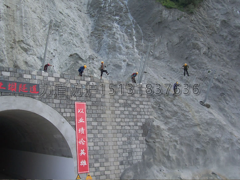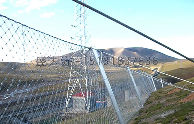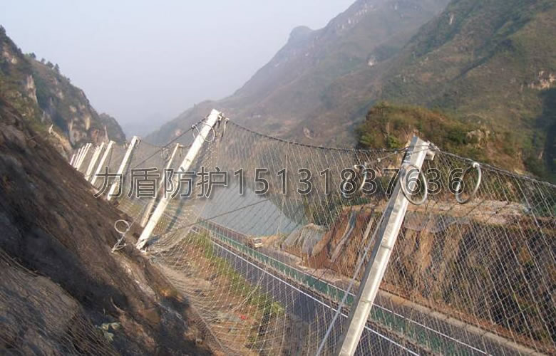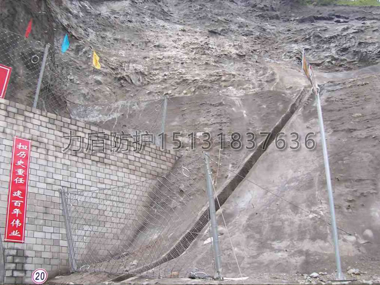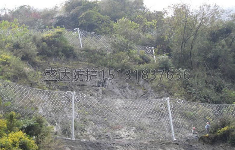 被动防护网是由钢丝绳网、环形网、(需拦截小块落石时附加一层铁丝格栅)、固定系统(锚杆、拉锚绳、基座和支撑绳)减压环和钢柱四个主要部分构成。钢柱和钢丝绳网连接组合构成一个整体,对所防护的区域形成面防护,从而阻止崩塌岩石土体的下坠,起到边坡防护作用。