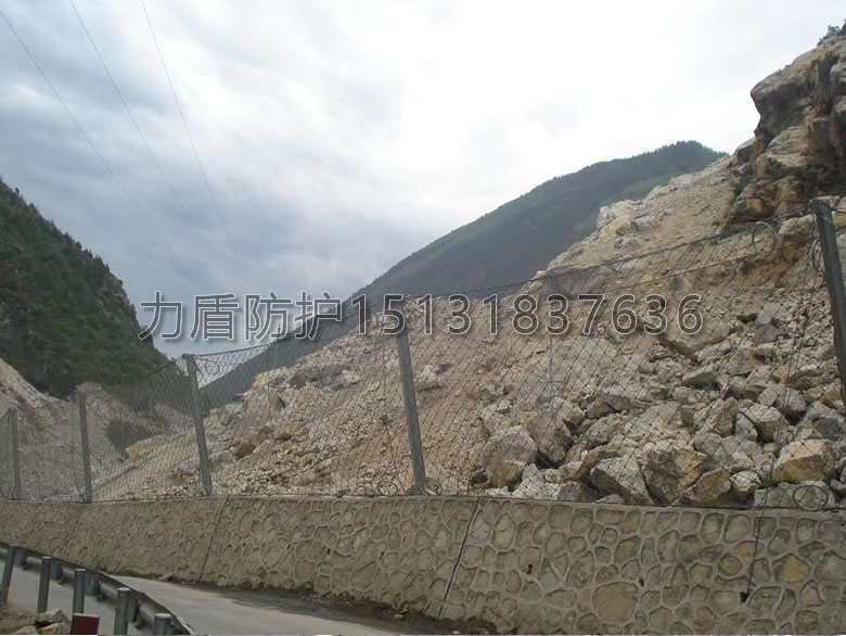 被动防护是由钢丝绳网、环形网、(需拦截小块落石时附加一层铁丝格栅)、固定系统(锚杆、拉锚绳、基座和支撑绳)减压环和钢柱四个主要部分构成。钢柱和钢丝绳网连接组合构成一个整体,对所防护的区域形成面防护,从而阻止崩塌岩石土体的下坠,起到边坡防护作用。